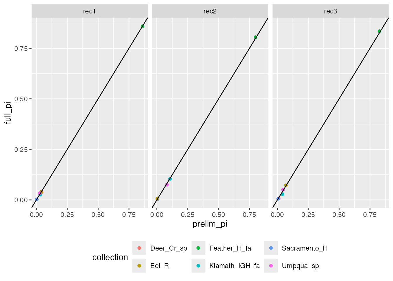 ggplot(prelimpi, aes(x = prelim_pi, y = full_pi, colour = collection)) +